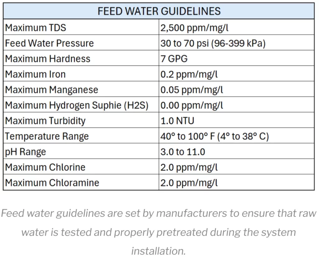 The chart below is taken from the Aqua Flo QCRO specification sheet. Every manufacturer will have a version of this chart available in their RO product literature or manuals. To ensure an RO system performs correctly, the incoming water must meet the manufacturer’s feed water guidelines before installation. This is particularly important to check on well or private water applications where pretreatment is the homeowner’s responsibility.